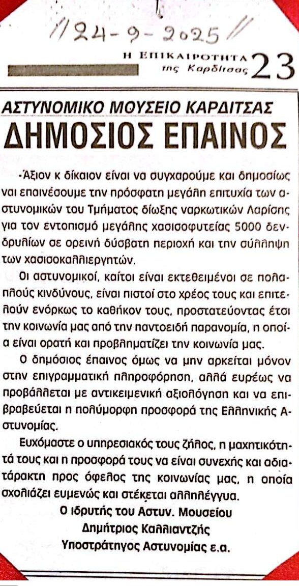 ΔΗΜΟΣΙΟΣ ΕΠΑΙΝΟΣ. Posted on 6 Οκτωβρίου, 20256 Οκτωβρίου, 2025 by karditsa-museum Related Post ΣΧΟΛΗ ΑΣΤΥΦΥΛΑΚΩΝ ΚΑΡΔΙΤΣΗΣ: Ιστορικές μήνες του χθες. Συγχαρητήριος έπαινος στον Κωνσταντίνο ΤΡΙΑΝΤΑΦΥΛΛΟΥ ΜΝΗΜΕΣ Αστυνομίας Πόλεων έτους 1947 Αστυνομικό Μουσείο Καρδίτσης – Εθνική Επέτειος 28.10.1940 – ΤΙΜΟΥΜΕ ΚΑΙ ΔΕΝ ΞΕΧΝΟΥΜΕ. Ευχές Χριστουγέννων 2025-2026